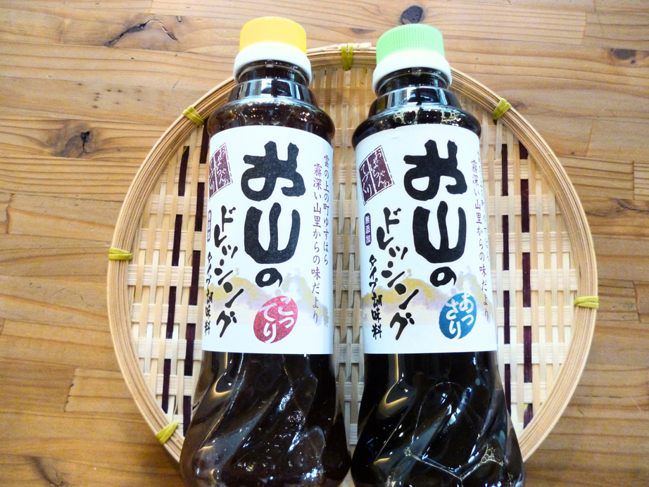 地元の女性グループ「若葉会」が手掛ける大人気ドレッシングはこってり味とあっさり味の2種類。ナスのたたきと相性抜群で、サラダや炒め物にも使えて万能!